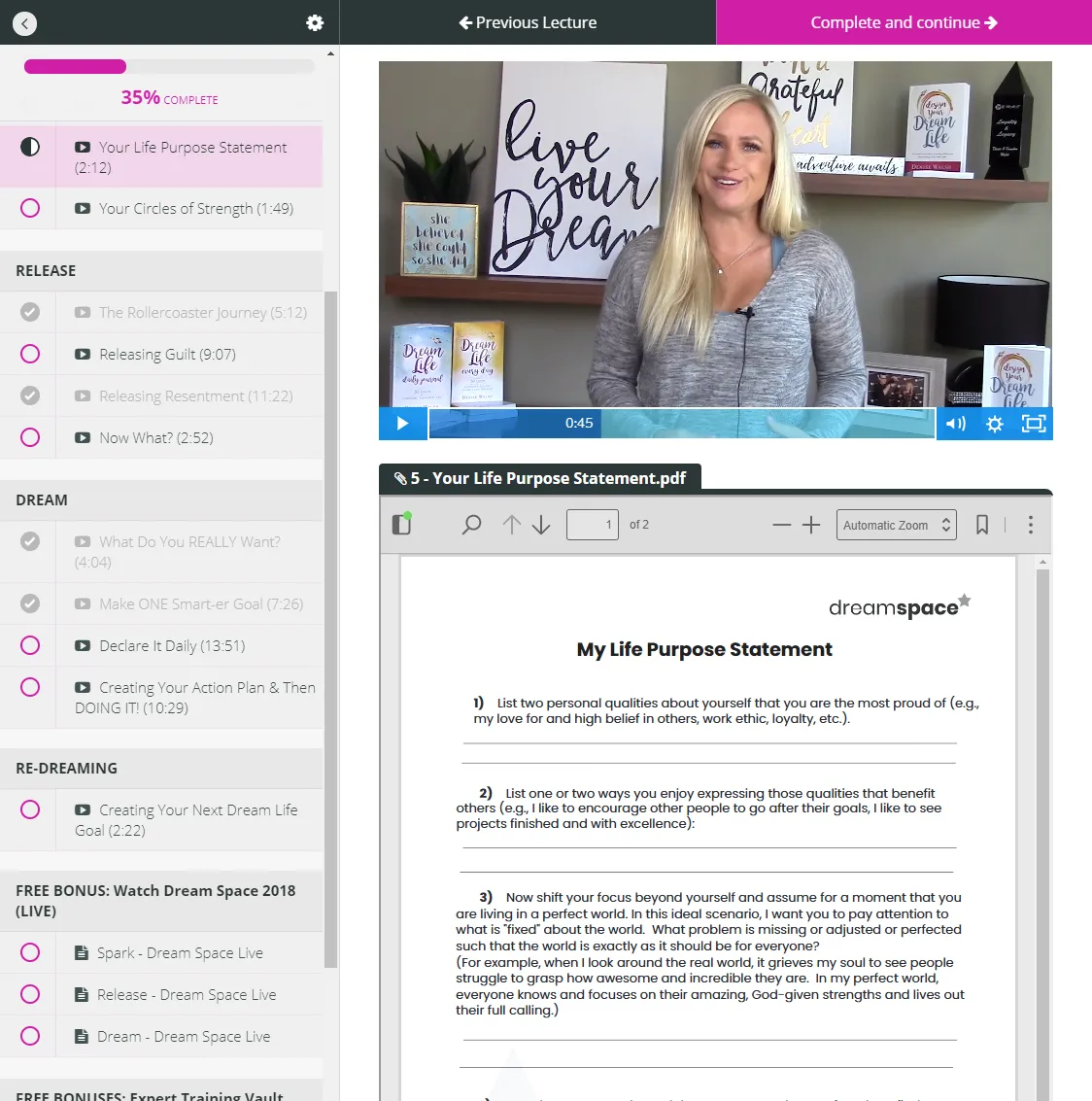Dream Space Online is an intimate course designed to get you taking purpose-driven action. There are three primary sessions: Spark, Release & Dream. Each module has a video training component as well as printable worksheets that allow for in-depth and experiencial learning.